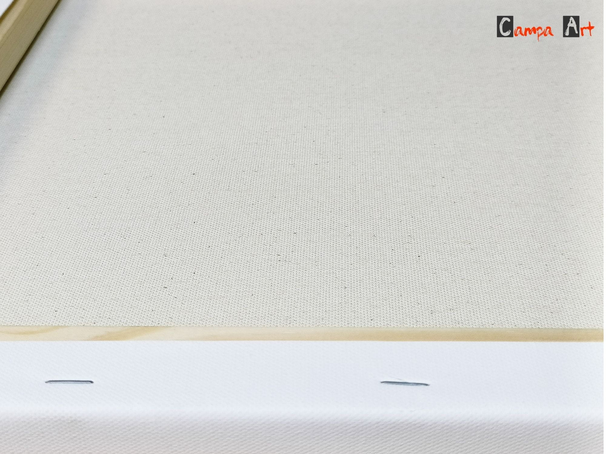 - płótno naciągane maszynowo, mocowane zszywkami z tyłu listwy, co daje możliwość zamalowania boków,